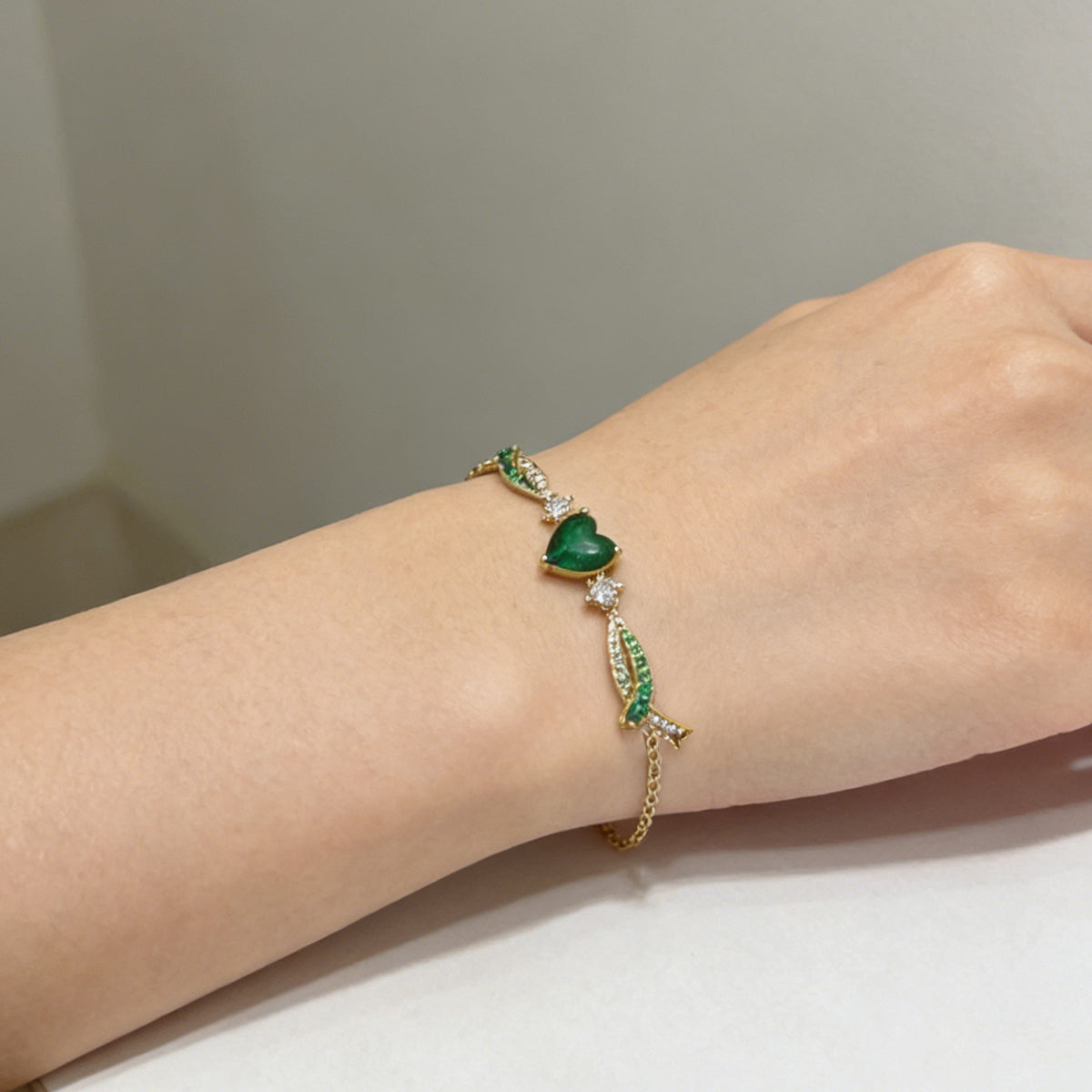 The Silhouette: A precision-cut heart centerpiece embraced by two arching wings, creating a floating effect on the wrist.