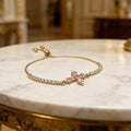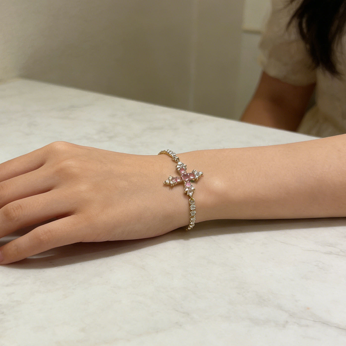 Embrace elegance with a message with the Faith Cross Crystal Bracelet. This beautiful piece combines the timeless sparkle of a tennis bracelet with a stunning cross centerpiece adorned with soft pink stones. It is designed for those who appreciate jewelry that is both deeply personal and effortlessly fashionable.