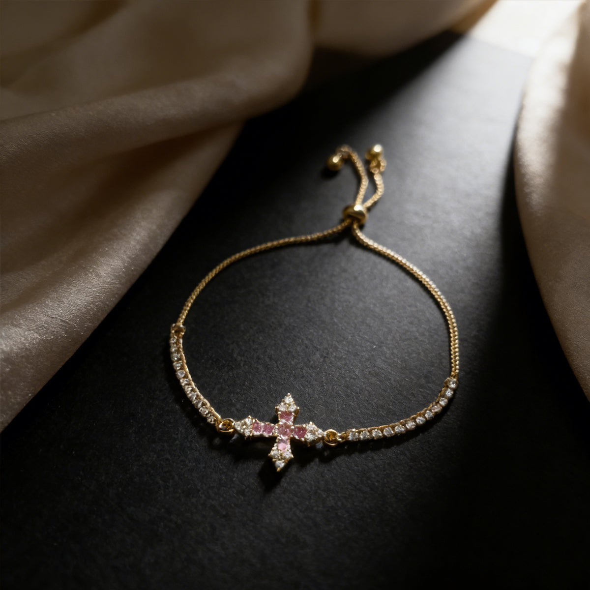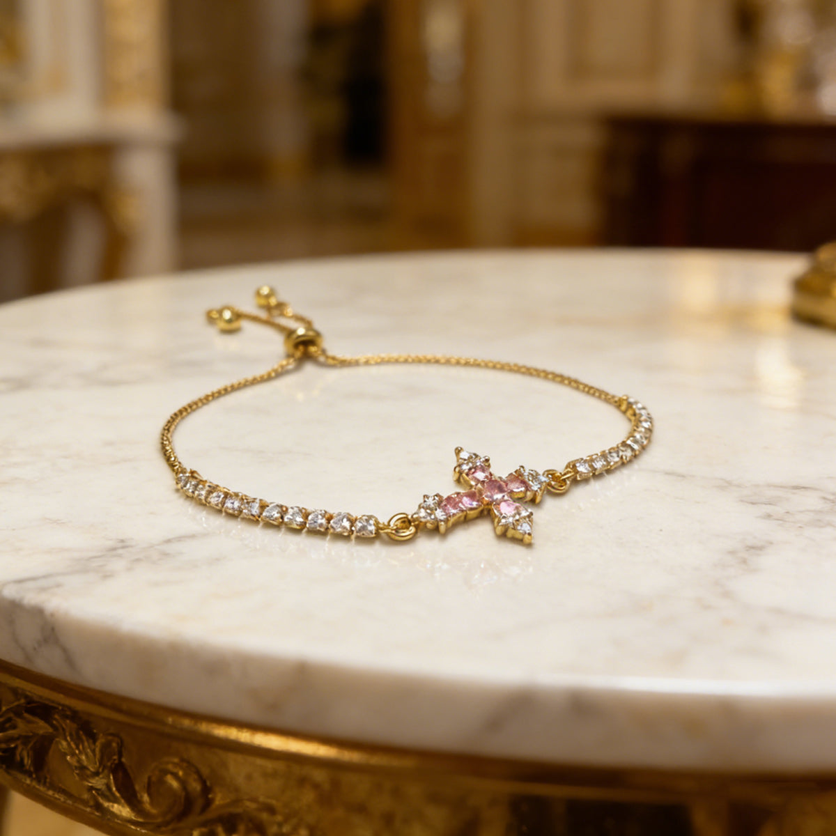 Symbolic Centerpiece: Features a beautifully crafted cross charm accented with pink and clear crystals for a gentle, feminine touch.