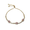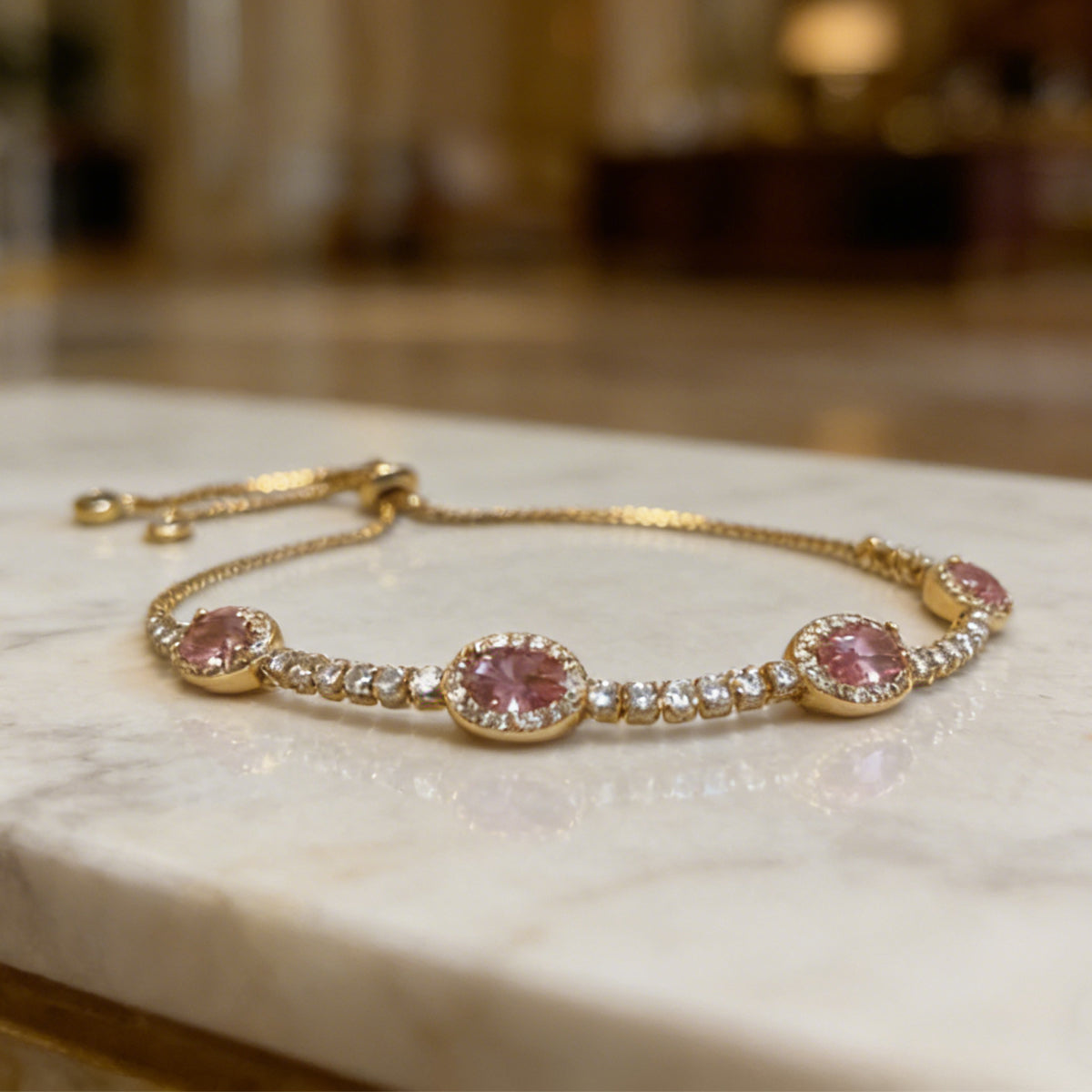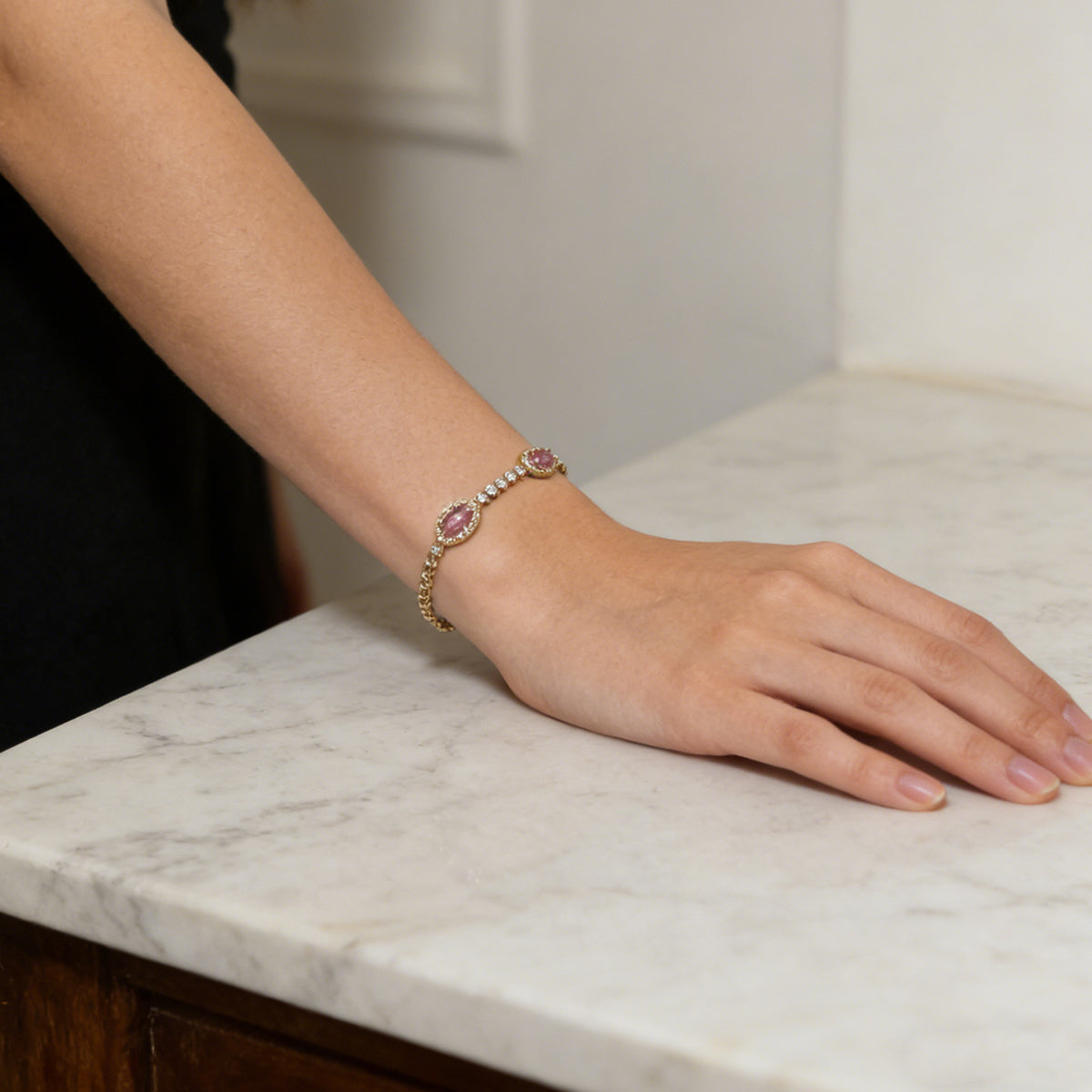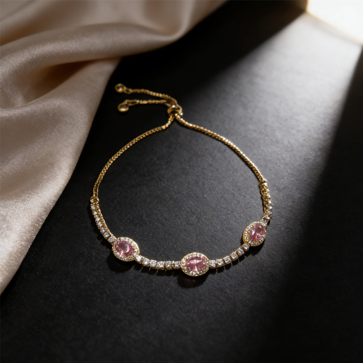 Redefine minimalist luxury with the Radiant Trio Aura. This sophisticated bracelet features three perfectly spaced oval-cut gemstones, each surrounded by a shimmering pavé halo that amplifies its natural glow. Set against a warm gold-finish chain, this piece offers a delicate balance of color and brilliance, making it the perfect accessory for both everyday elegance and special evening occasions.